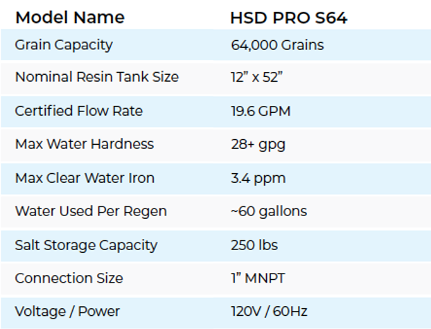The HSD PRO Series S64 64,000 Grain Capacity Water Softener delivers professional-grade performance designed to eliminate hard water problems throughout the entire home. Using premium resin, high-flow tanks, and our industry-leading ceramic disc valve technology, it provides reliable soft water that protects plumbing, improves appliance efficiency, and enhances cleaning results. Intelligent metering regenerates only when needed—saving salt, water, and energy—while the system’s durable American-made construction ensures years of trouble-free operation. Every unit includes everything required for installation, giving homeowners a dependable, high-performance solution backed by one of the best warranties in the industry.